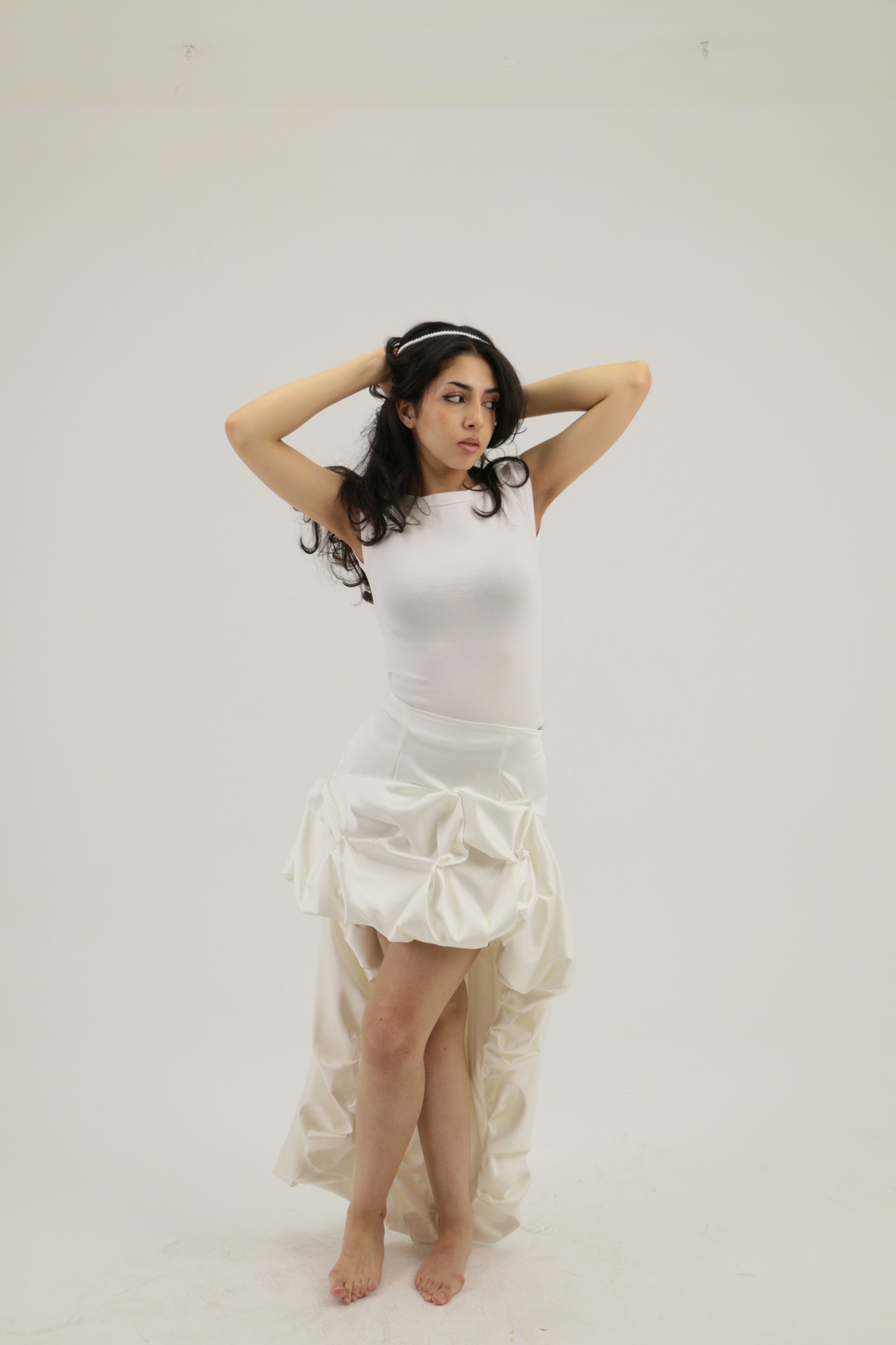 This skirt is all about effortless drama. Made from soft, glossy satin, it has delicate gathers at the front that give it texture and shape, while the high-low cut shows off your legs and lets the fabric flow beautifully behind you. It’s playful yet elegant, the kind of piece you can dress up or keep simple depending on your mood.